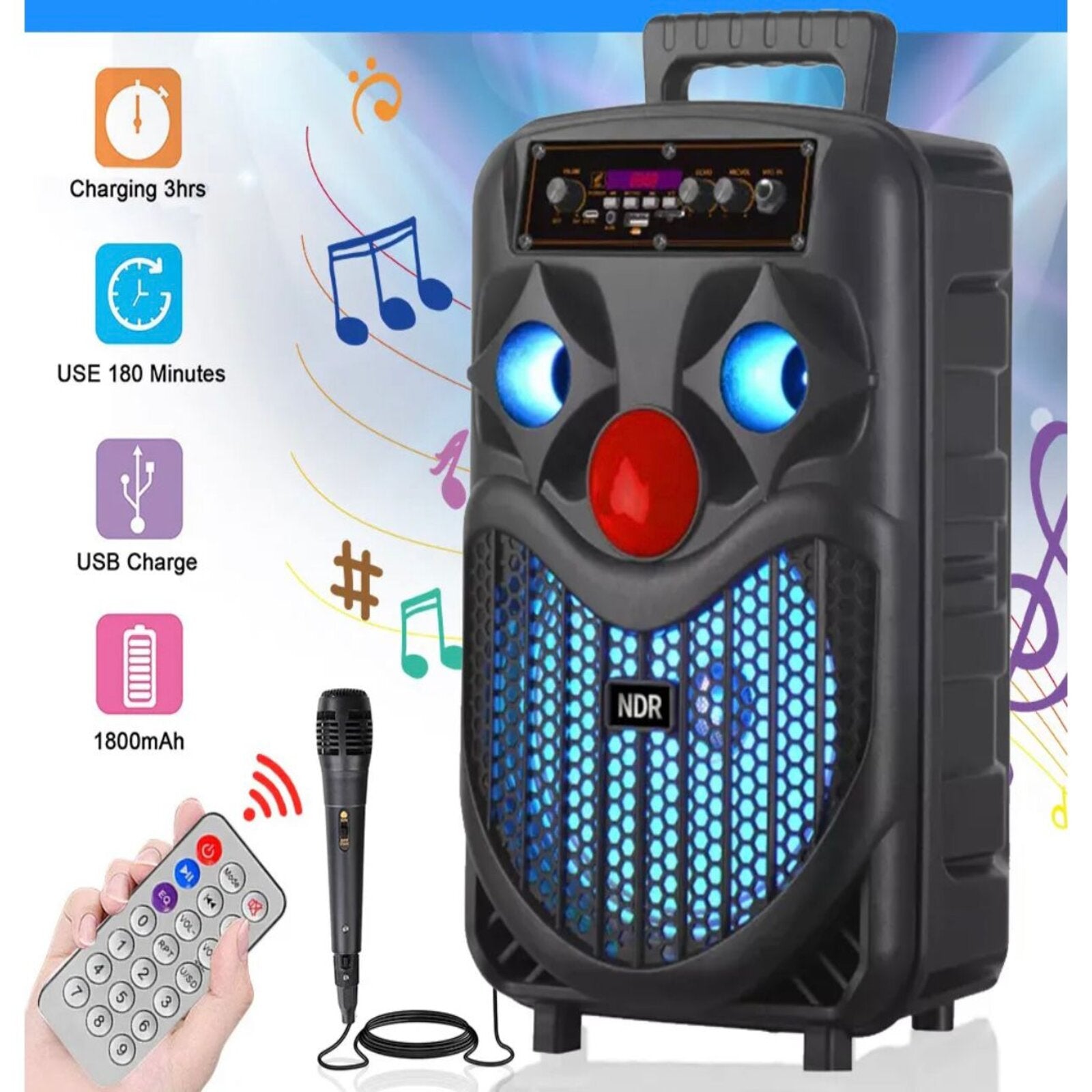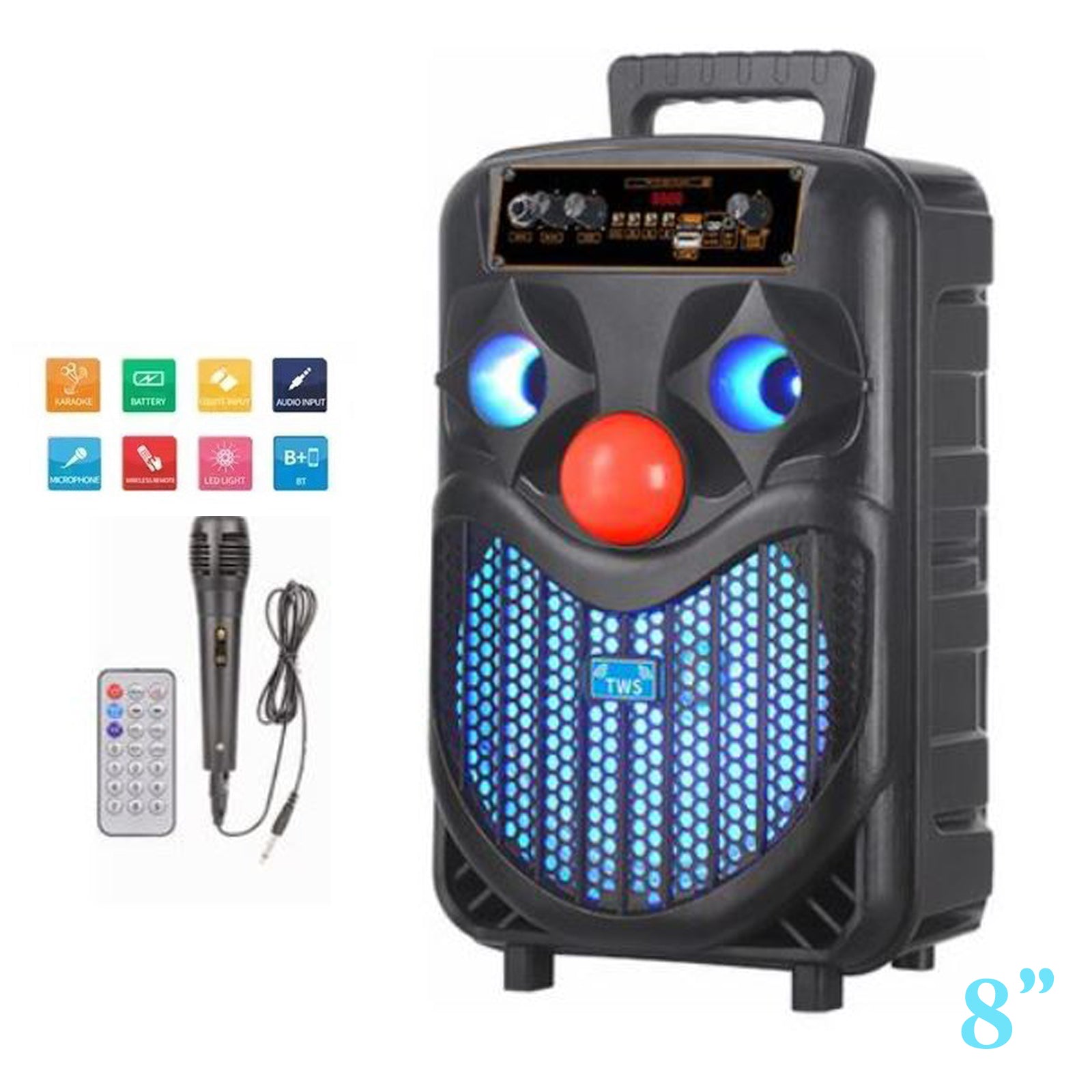-Támogatja az USB/TF/FM/Bluetooth-ot, többszínű LED-es fényeket, 8 hüvelykes hangszórót, hangerőszabályzó gombot