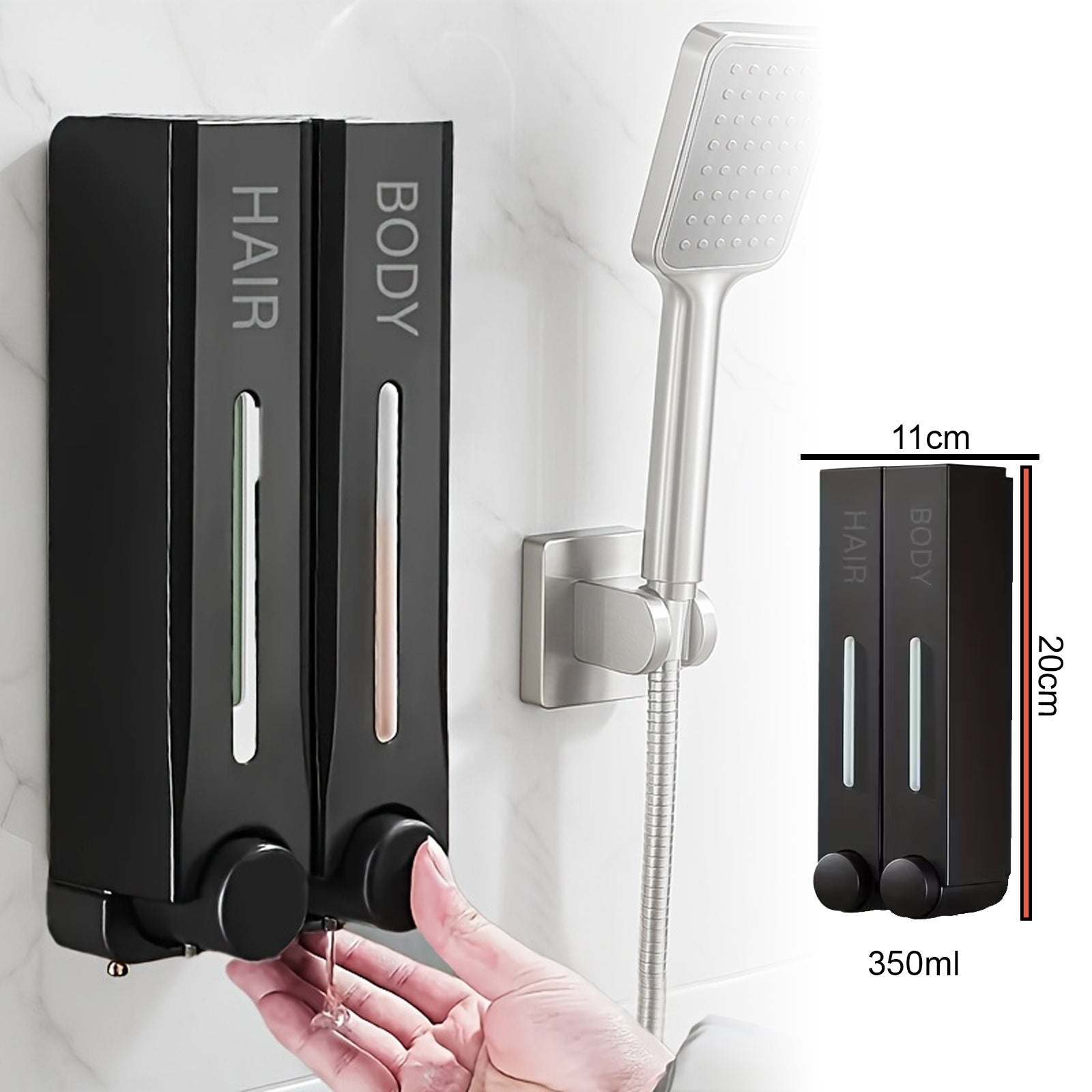 Tegye rendbe fürdőszobáját ezzel a modern dupla adagolóval szappanhoz, samponhoz vagy tusfürdőhöz. Minimalista design, egyszerű használat és maximális praktikum egyetlen termékben.