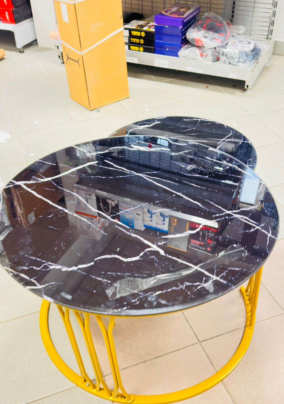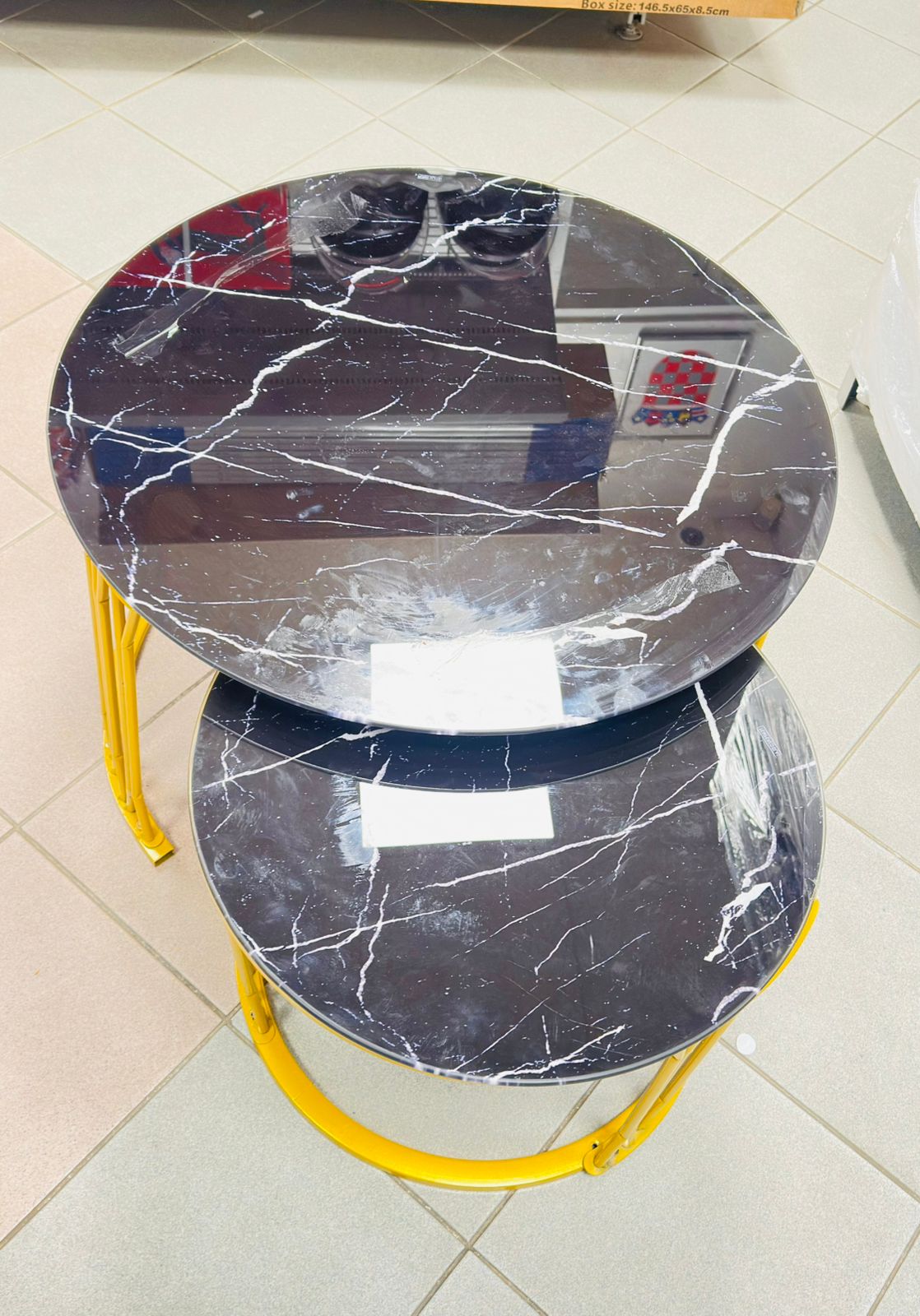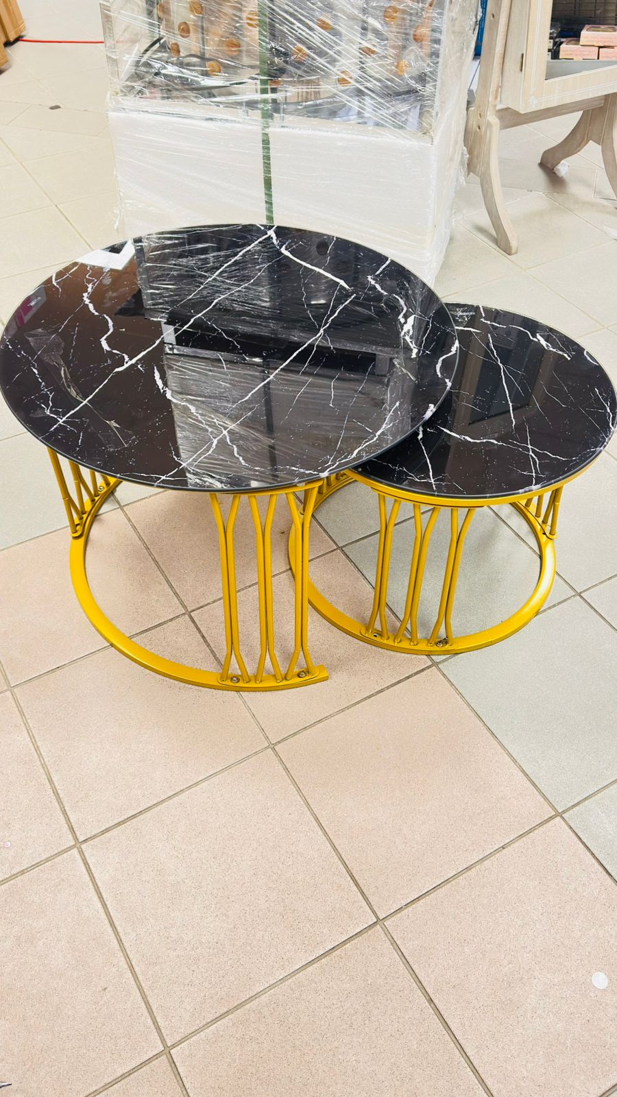 Elegáns, két részes dohányzóasztal szett fekete márvány hatású felülettel és arany színű fém vázzal. Használható együtt, rétegezett elrendezésben, vagy külön-külön a térben.