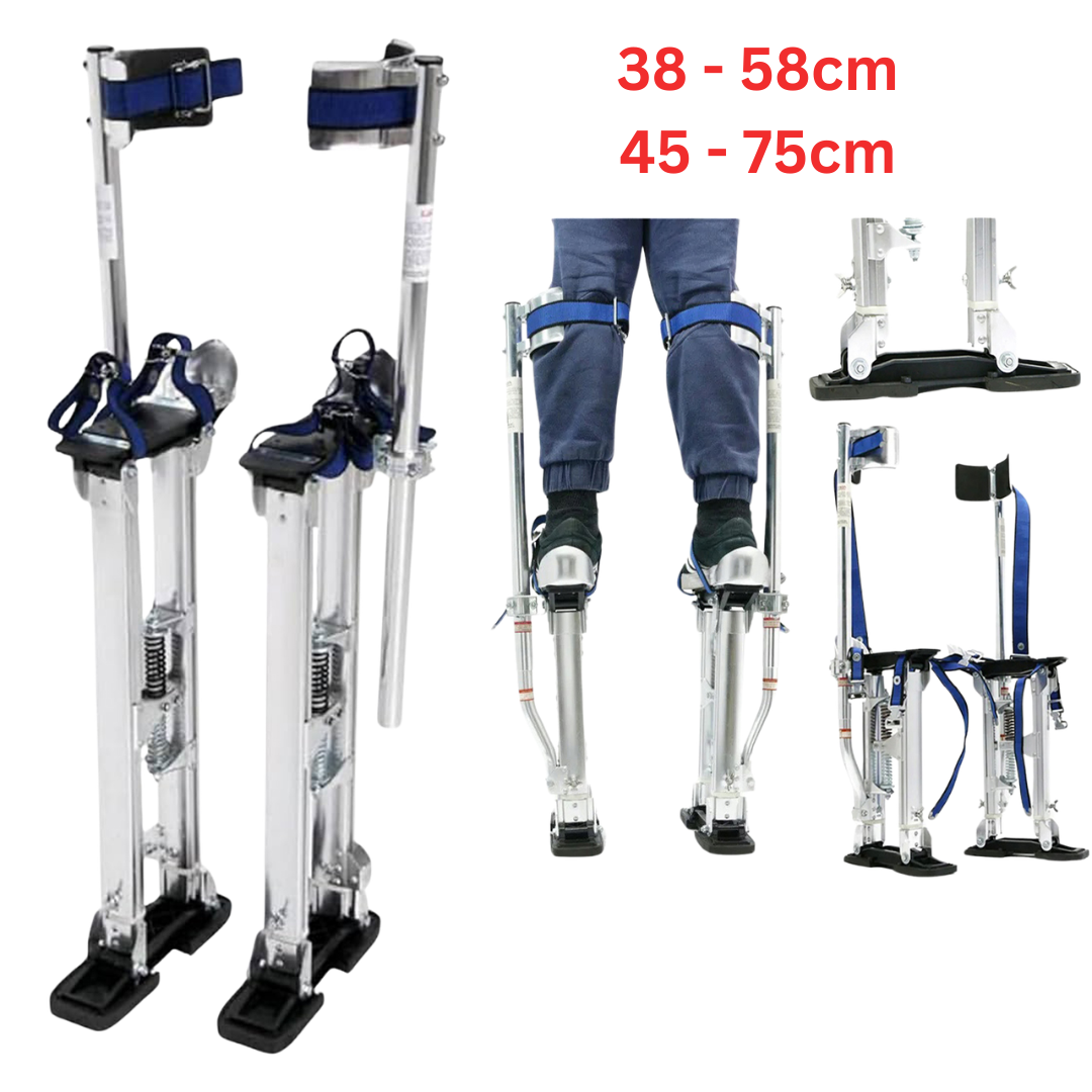Professzionális alumínium gólyalábak, amelyeket magasban végzett munkákhoz terveztek, például gipszkarton szereléshez, mennyezetekhez, installációkhoz és egyéb építőipari munkákhoz.